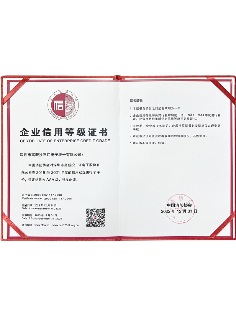 深圳市高新投三江電子股份有限公司矢志成為一流的建筑安全和智能化解決方案供應商,以“創(chuàng)造安全世界,共享智能生活”為愿景,憑借在消防領域多年的經(jīng)驗積累,積極運用前沿技術,不斷提升產(chǎn)品品質、服務質量,提供創(chuàng)新和更具競爭力的解決方案,與客戶和合作伙伴一起為構建安全、智能的宜居環(huán)境而不懈努力。